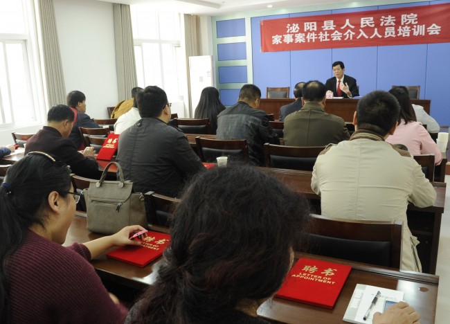 稳固的家庭关系是维系社会和谐的基石,妥善处理各类家事纠纷是“泌阳县家事案件社会工作介入委员会”成员单位的共同责任。2016年10月19日上午,“泌阳县家事案件社会工作介入委员会”在泌阳法院正式成立之后,泌阳法院向三十多位家事案件调解员发放聘书,并进行家事案件调解方面的法律培训和业务指导。