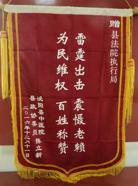 2016年12月13日上午,泌阳县政协委员、泌阳县中医院副院长陈立新,把一面金灿灿的锦旗递给了泌阳法院的执行法官,锦旗上的烫金大字“雷霆出击,震慑老赖。为民维权,百姓称赞”熠熠生辉。这一幕,就发生在泌阳法院的大门口。