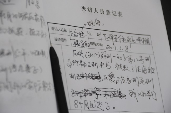 2017年6月8日上午,泌阳县法院接待室,少年庭庭长、正科级审判员李全义,带着输液吊瓶正在接待来访群众。三瓶输液瓶就挂在接待室的窗户上,左手腕部的血管还连接着输液针头,带班接访的院领导韩会丽帮着拔针换上另一瓶输液瓶。